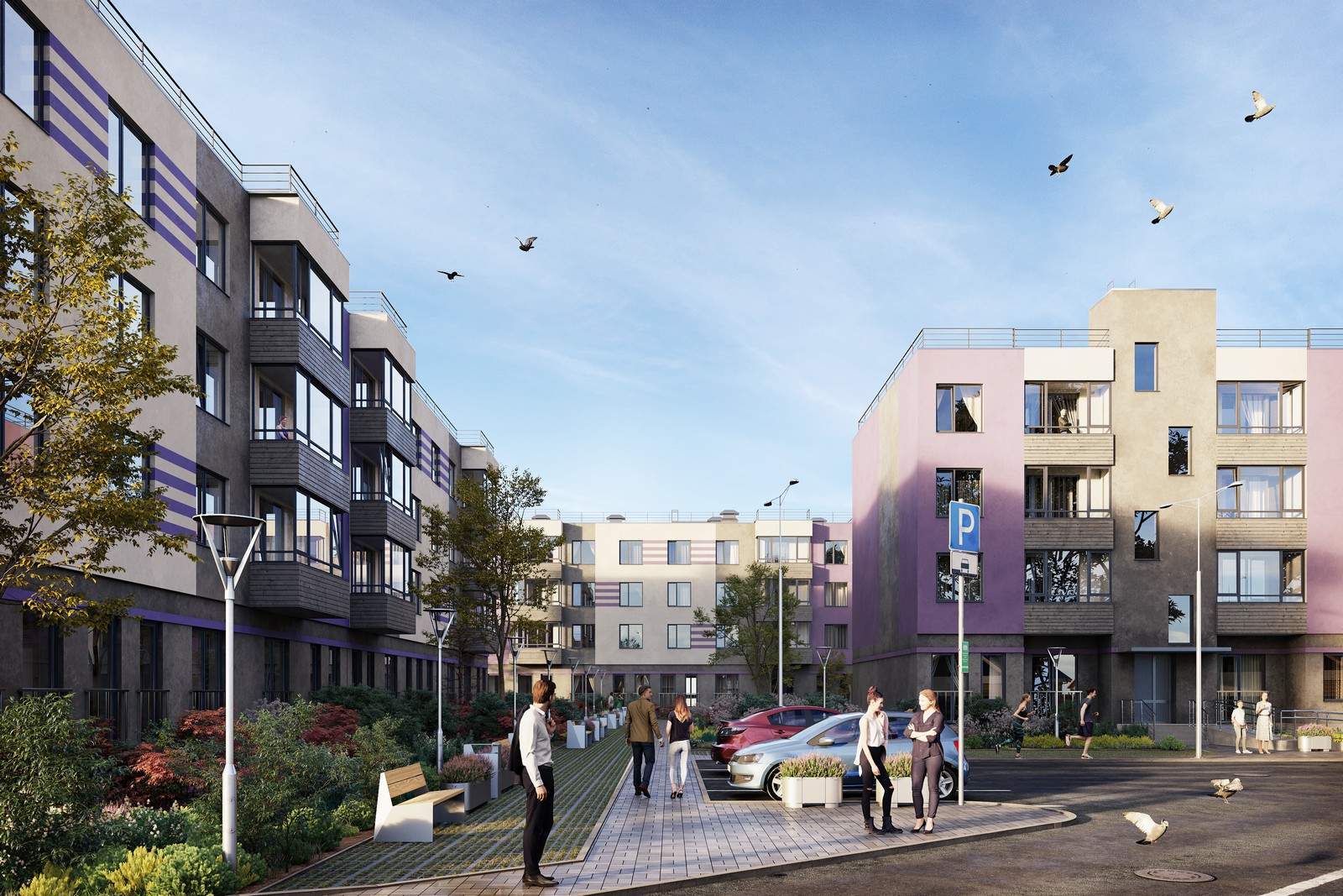 В 10-ти четырехэтажных корпусах сможет поселиться 1171 семья. Дома располагаются блоками, образуя уютные закрытые и безопасные дворы с большим количеством зеленых насаждений и с зонами отдыха для взрослых и детей.
